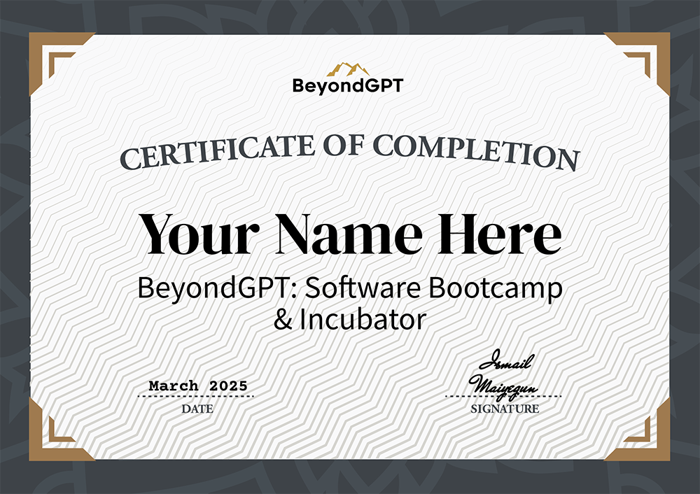 BeyondGPT: Software Bootcamp & Incubator is a program focused on empowering non-technical founders to go from idea to product, launch & initial users in 9 weeks without relying on finding a technical founder or unreliable dev shops or spending thousands on development.